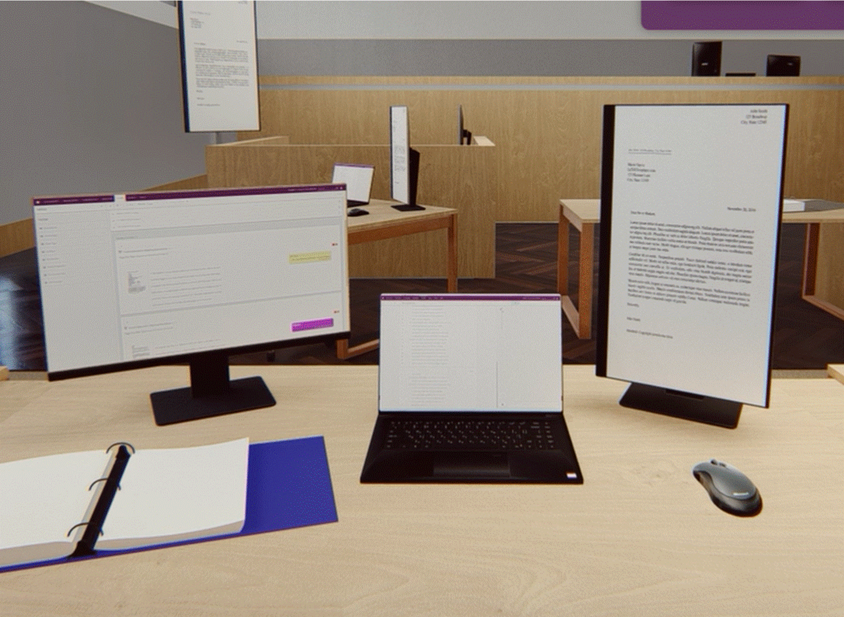 The extended monitor (screen on the left in the picture) is an extension of the Opus 2 laptop which will provide the individual with dual screen capabilities. For example, this will allow the individual to have the live transcript on one screen and the electronic hearing bundle on the second screen.