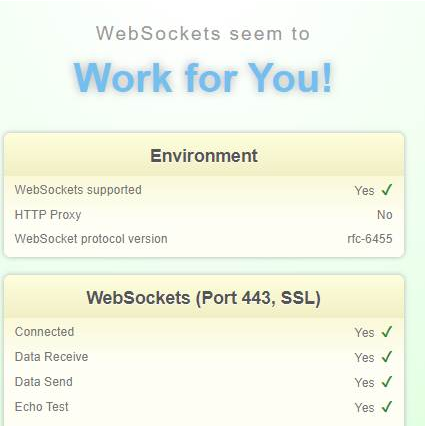 - Within the checklist on the page, the results should show “Yes” for all WebSocket tests.